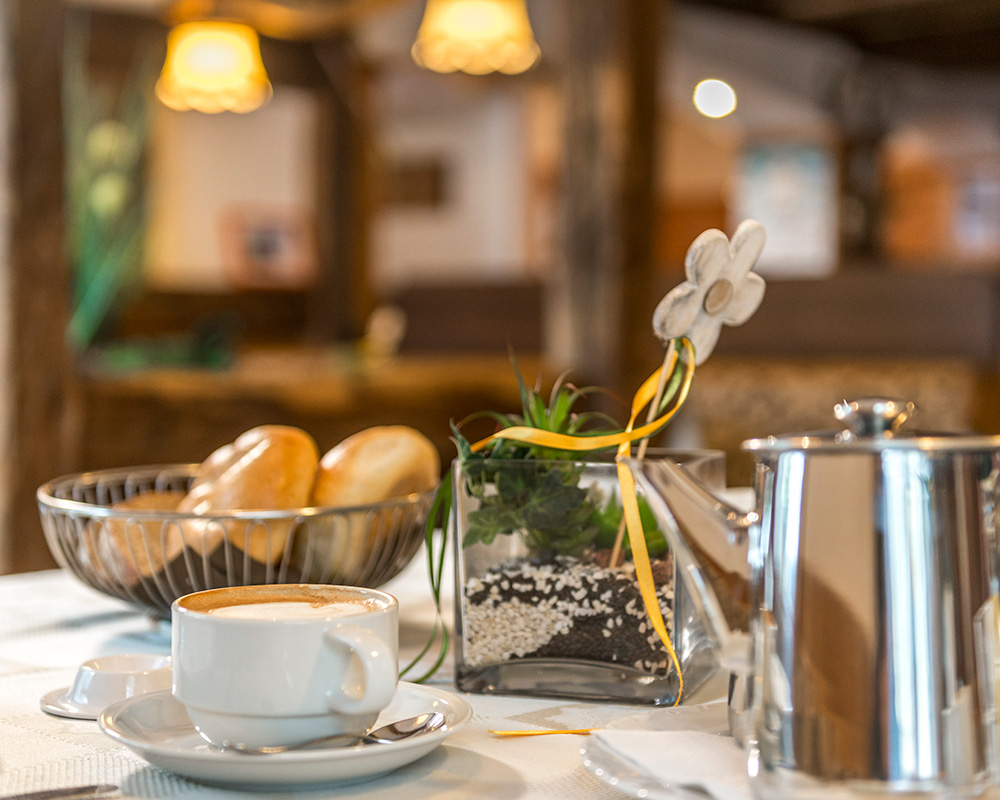 Presso il nostro bed and breakfast in Alto Adige ogni mattina si può gustare una colazione gustosa e variegata, che viene servita nel ristorante “Zum Sepp” situato nell’edificio attiguo. Qui se lo desiderate potete gustare anche ottimi pranzi e cene sfiziose.